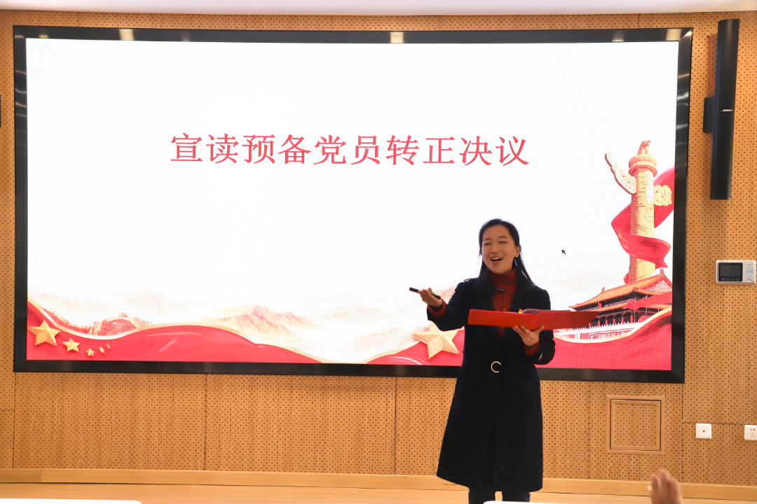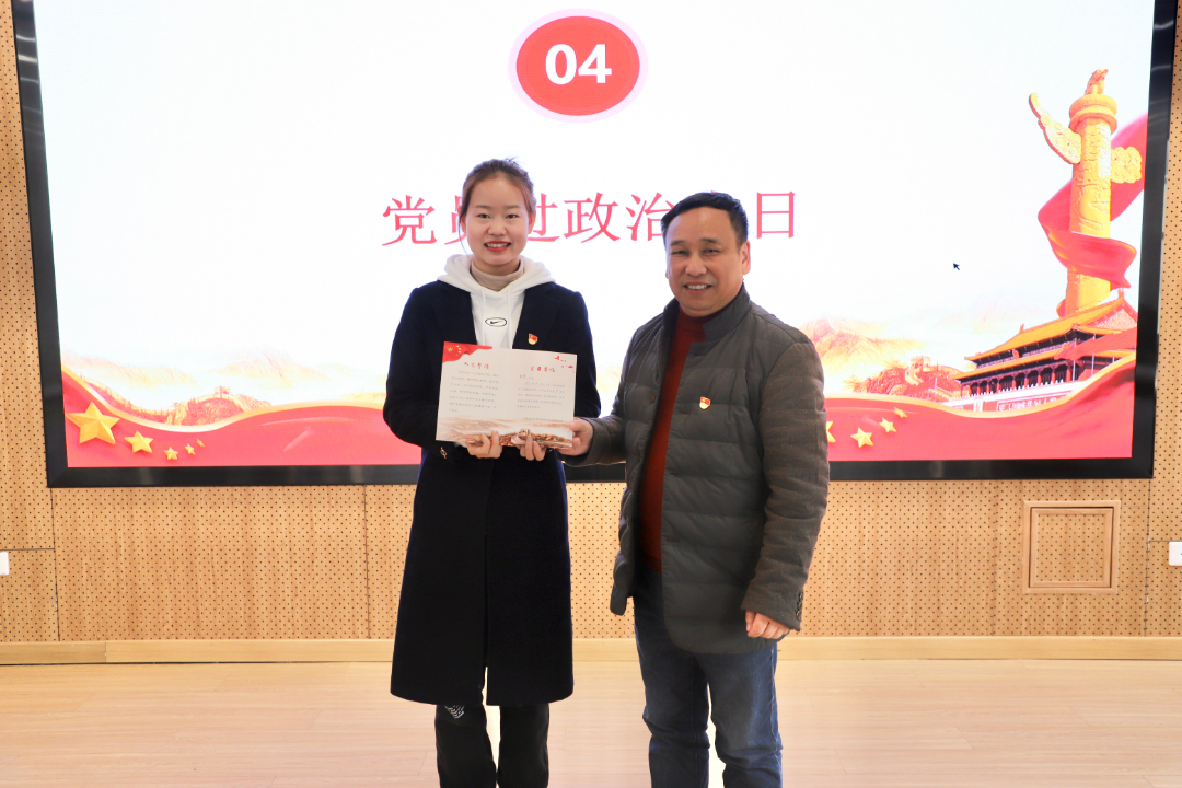 接着刘诗慧同志讲述了她的入党初心,她认为作为党员教师,要做到勤奋敬业,扎实工作,不辱使命,要从学习、珍惜、责任、勤奋和感恩五个方面下功夫。要以勤奋自励、奋发有为的状态,扎实工作,用实际行动为党徽添彩,为党旗增色,为经外贡献自己的一份力量。张莉同志为她赠送了良言诤语,希望她用实际行动践行对信仰的承诺,增强党员的责任感和使命感。