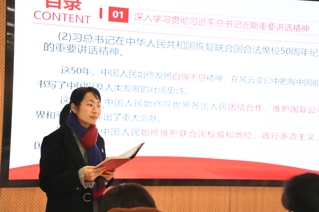 接着,罗娜同志带领大家一起学习了“习总书记在中华人民共和国恢复联合国合法席位50周年纪念会议上的重要讲话精神”。全体党员同志认识到,在恢复联合国合法席位的五十年里,中国人民始终发扬自强不息精神,在风云变幻中把握中国前进方向,书写了中国以及人类发展的壮阔史诗;终同世界各国人民团结合作,维护国际公平正义,为世界和平与发展作出了重大贡献;始终维护联合国权威和地位,践行多边主义,中国同联合国合作日益深化。罗娜同志也呼吁大家携起手来,将个人理想熔铸到祖国的发展蓝图之中,献身教育,无私耕耘,为中国梦的伟大实现助力添彩。