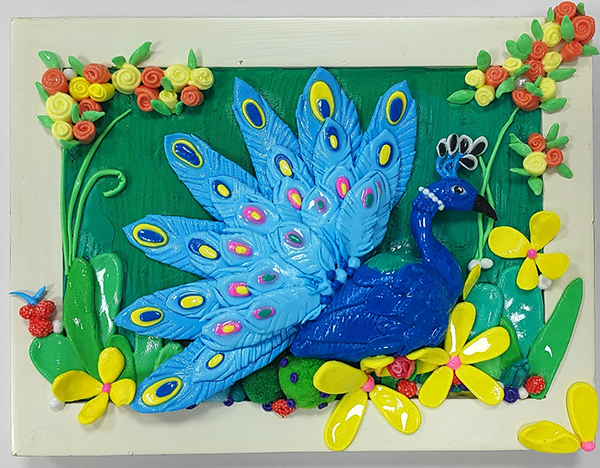 这只孔雀是用黏土和软泥做的,摸起来很光滑,拿起来很轻,我非常喜欢这只孔雀,看着自己的劳动成果,我很开心,你们呢?